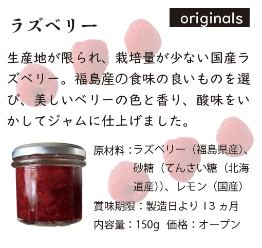 原材料:ラズベリー(福島県産)、砂糖(てんさい糖(北海道産))、レモン(国産)